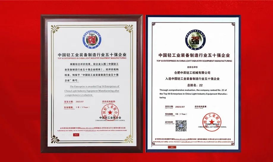 中辰輕機榮獲中國輕工業(yè)裝備制造行業(yè)五十強企業(yè)、中國液態(tài)食品機械行業(yè)十強企業(yè)重磅榮譽